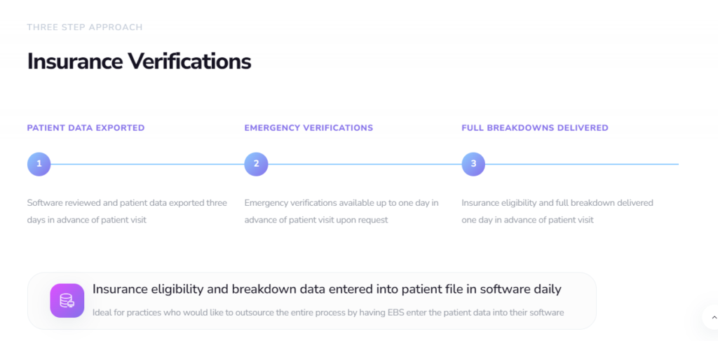 Reasons to Outsource Eligibility Verification Service. We understand that navigating the complexities of dental insurance plans can be time-consuming and challenging for dental practices. That’s why we’re here to simplify the process and ensure accurate verification of coverage details. Our dedicated team of professionals specializes in gathering essential information to minimize billing errors and maximize revenue for your practice. Let us handle all of your dental eligibilities and breakdown of benefits.